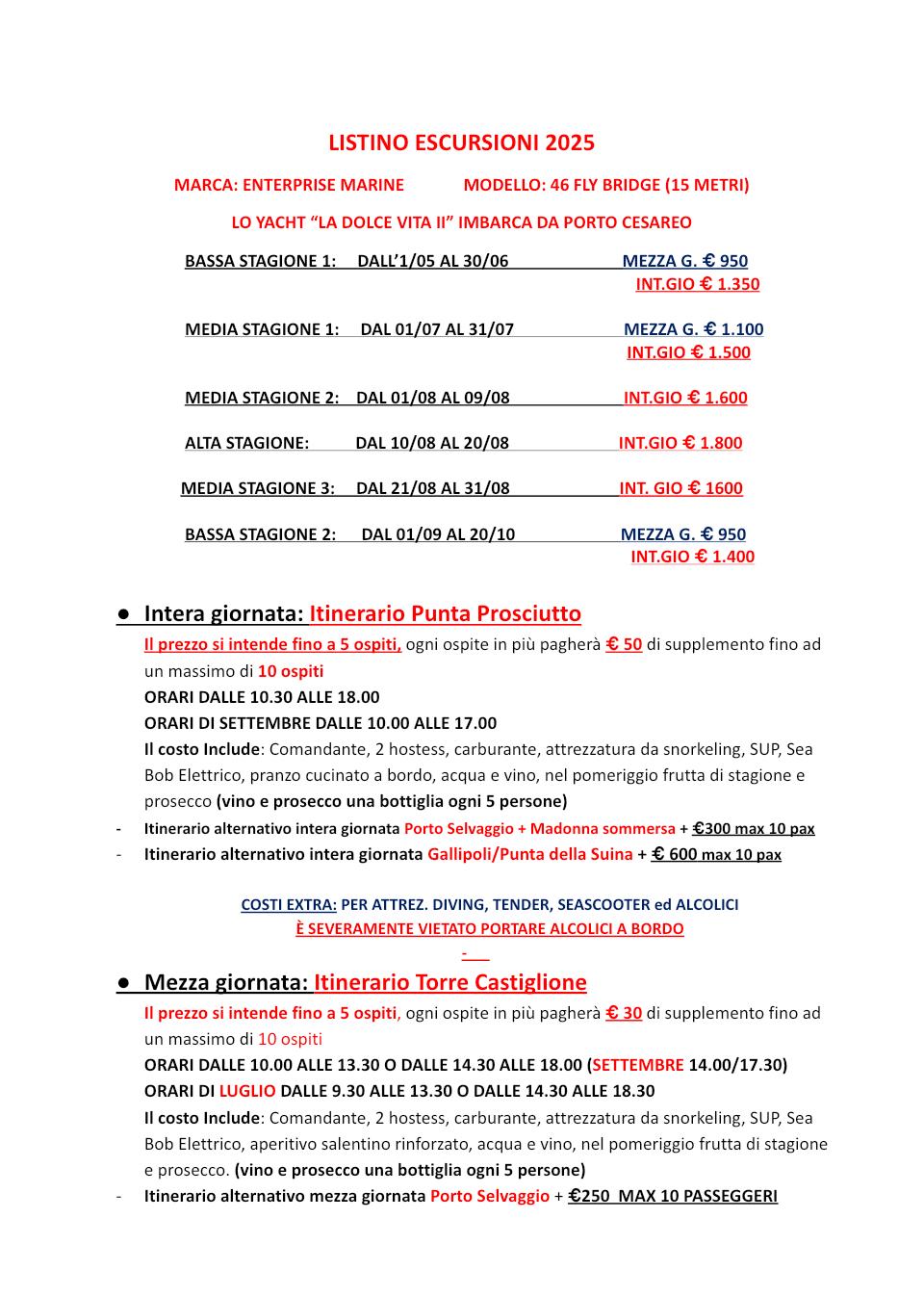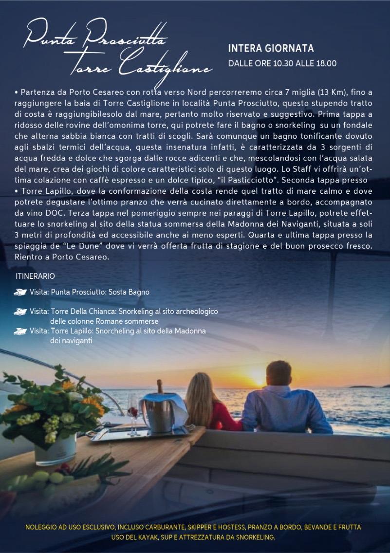 Le Escursioni in Barca da Porto Cesareo a bordo dello yacht La Dolce Vita II propongono sempre la formula All Inclusive che include, oltre all’equipaggio, la colazione con prodotti tipici salentini, pranzo cucinato direttamente a bordo, vini pregiati autoctoni, aperitivi ed altro. Durante le Escursioni ci saranno a vostra disposizione anche attrezzature acquatiche di vario tipo, come Kayak, SUP, gonfiabili vari, attrezzatura da Snorkeling e Sea Bob elettrico. Il Comandante vi consiglierà la meta costiera da raggiungere in base alle vostre esigenze, tenendo sempre in considerazione le condizioni del mare, del vento, del numero di ospiti e della tipologia degli ospiti (bambini, anziani o donne in gravidanza), per garantirvi sempre una giornata all’insegna del Relax e del Divertimento ed in particolar modo della Sicurezza. Scegliere il Noleggio dello Yacht La Dolce Vita II a Porto Cesareo è la scelta giusta, vi aspettiamo a Bordo.