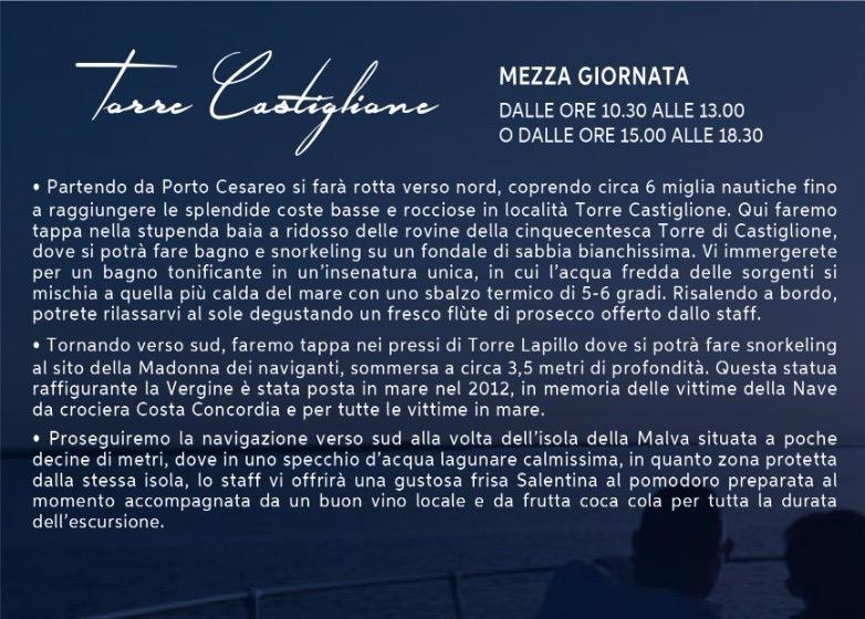 Il nostro Snorkeling-Tour si svolge nell’Area marina Protetta di Porto Cesareo, ha una durata di tre ore e prevede tre soste bagno di cui due con snorkeling con attrezzatura fornita da noi, l’ultima sosta si svolge in una delle calette naturali scelte a discrezione del comandante. Il tour si conclude con un aperitivo offerto da noi a base di prodotti tipici e vino autoctono.